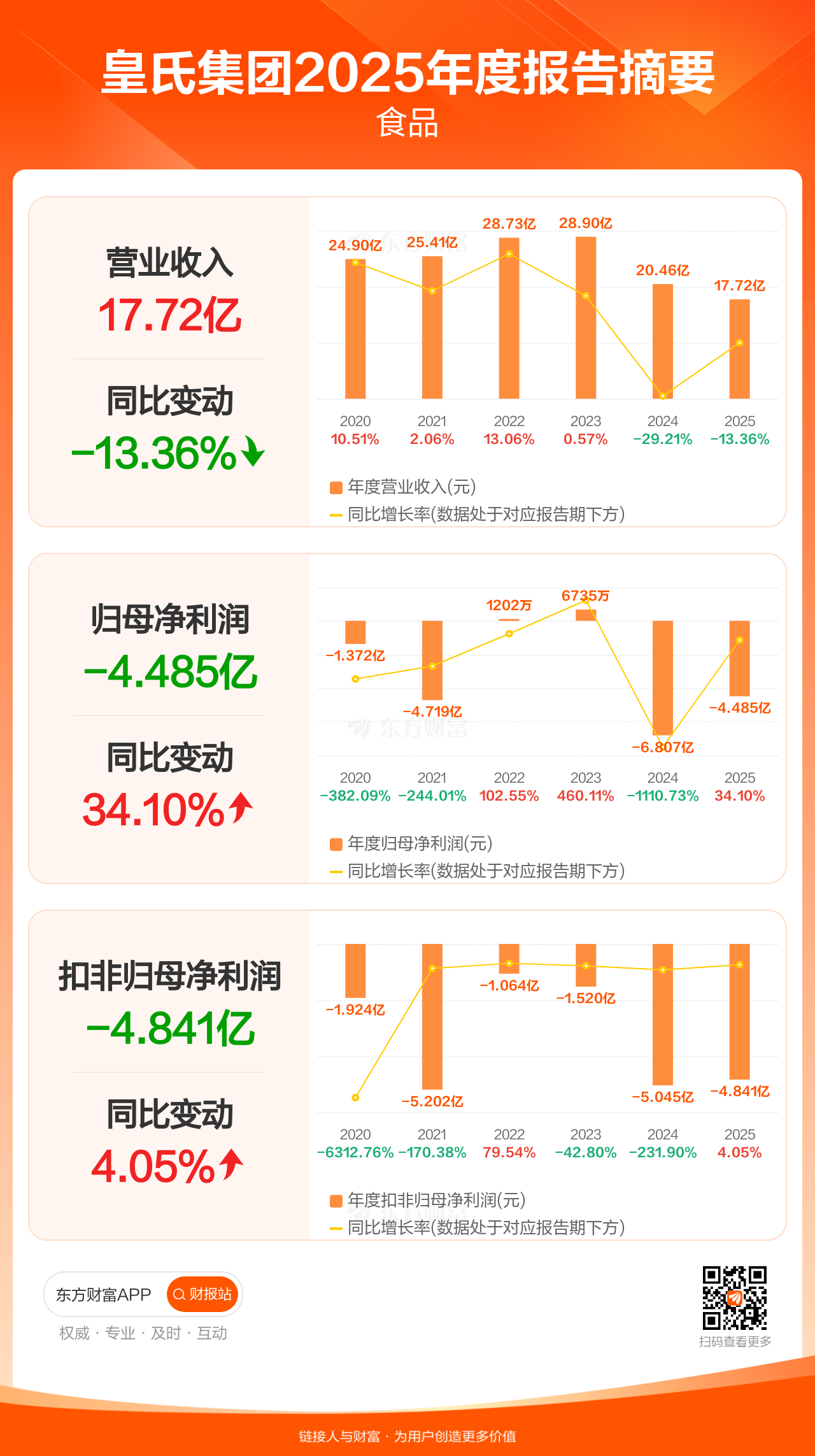 皇氏集团4月27日发布2025年年报显示,公司全年实现营业收入17.72亿元,同比下滑13.36%;归母净利润-4.49亿元;扣非归母净利润-4.84亿元。
