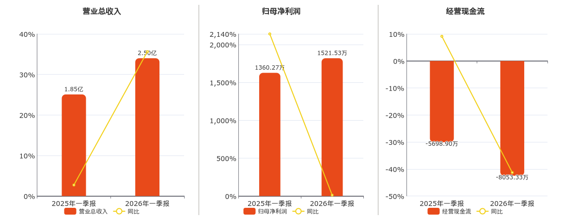 公司营业总收入为2.50亿元。归母净利润为1521.53万元。经营活动现金净流入为-8053.33万元,较去年同报告期经营活动现金净流入减少2354.43万元。