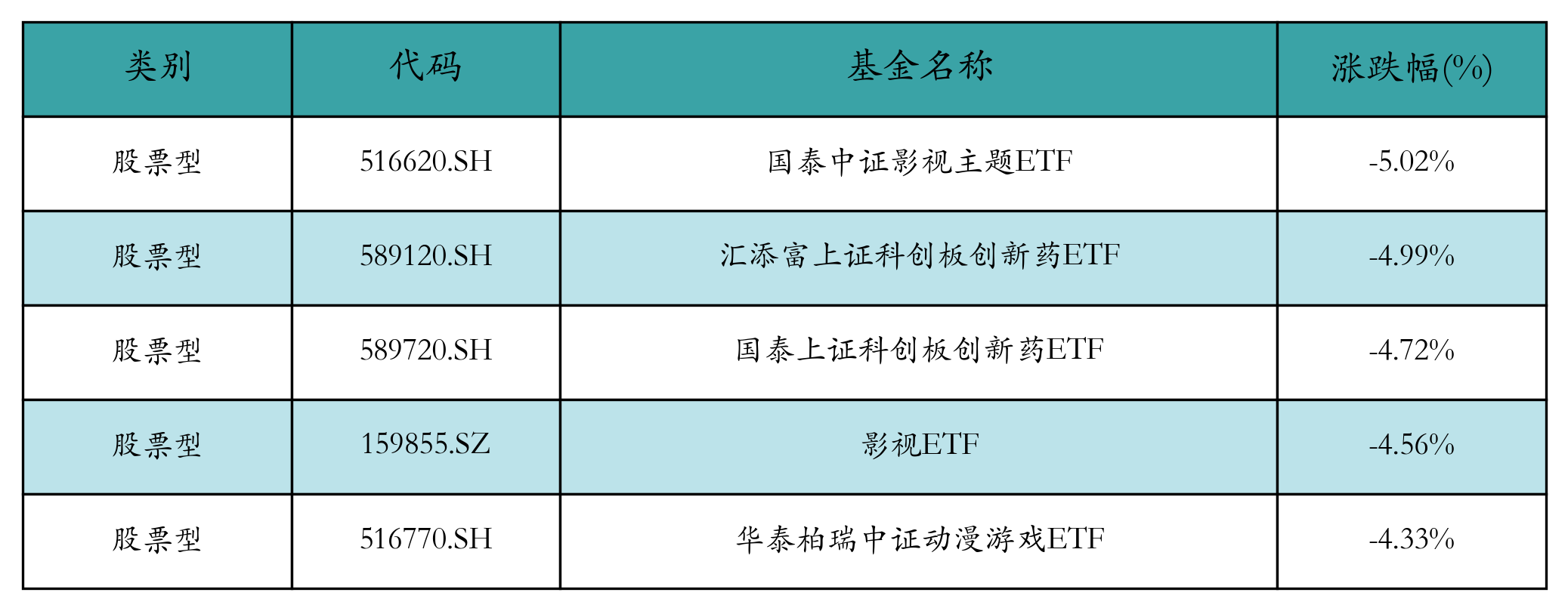 上周股票型ETF跌幅最大的5只ETF及其收益率分别为:国泰中证影视主题ETF(-5.02%)、汇添富上证科创板创新药ETF(-4.99%)、国泰上证科创板创新药ETF(-4.72%)、影视ETF(-4.56%)、华泰柏瑞中证动漫游戏ETF(-4.33%)。详情见下表:
