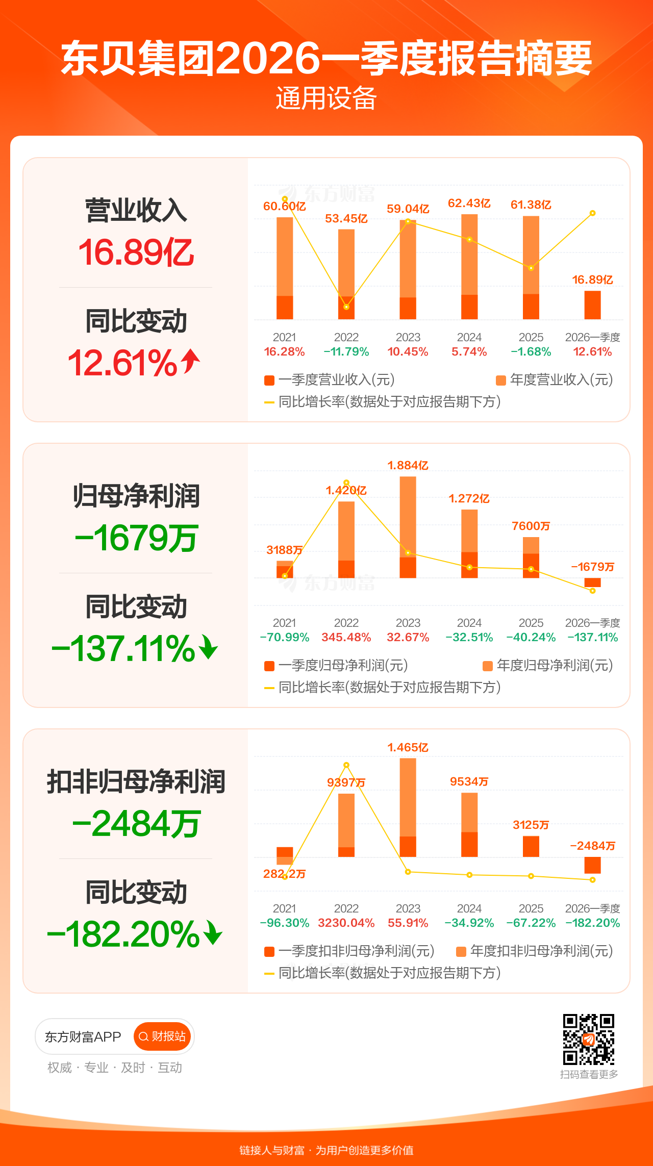 东贝集团4月28日发布2026年一季报显示,公司一季度实现营业收入16.89亿元,同比增长12.61%;归母净利润-1679.21万元;扣非归母净利润-2484.20万元。