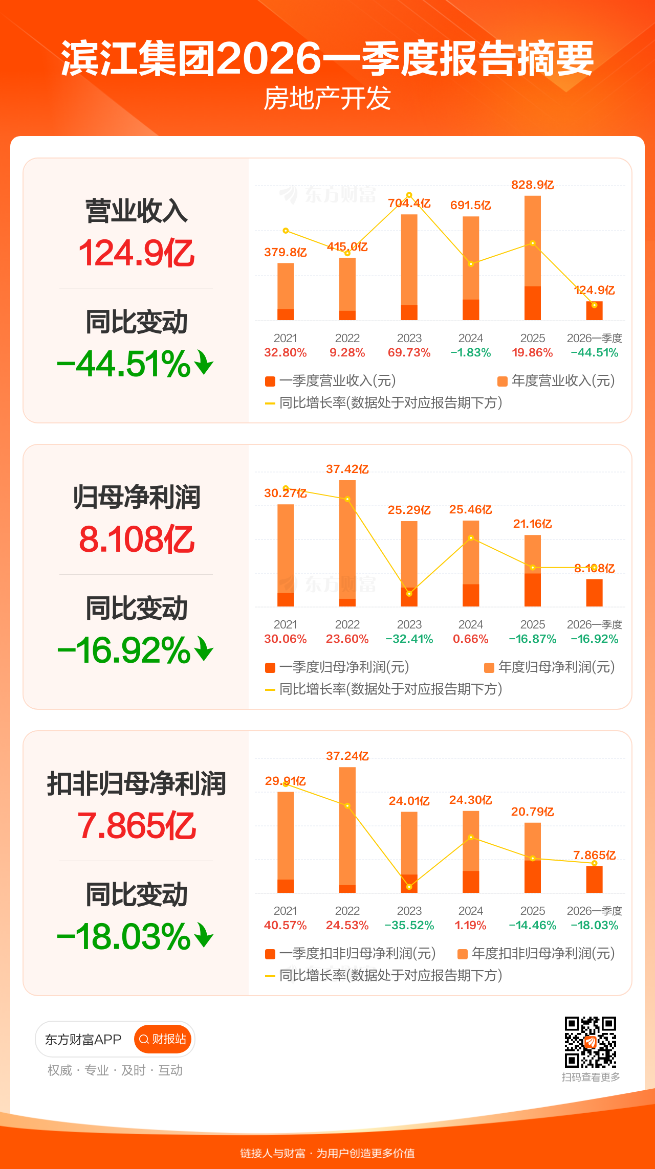 滨江集团4月28日发布2026年一季报显示,公司一季度实现营业收入124.90亿元,同比下滑44.51%;归母净利润8.11亿元,同比下滑16.92%;扣非归母净利润7.87亿元,同比下滑18.03%。