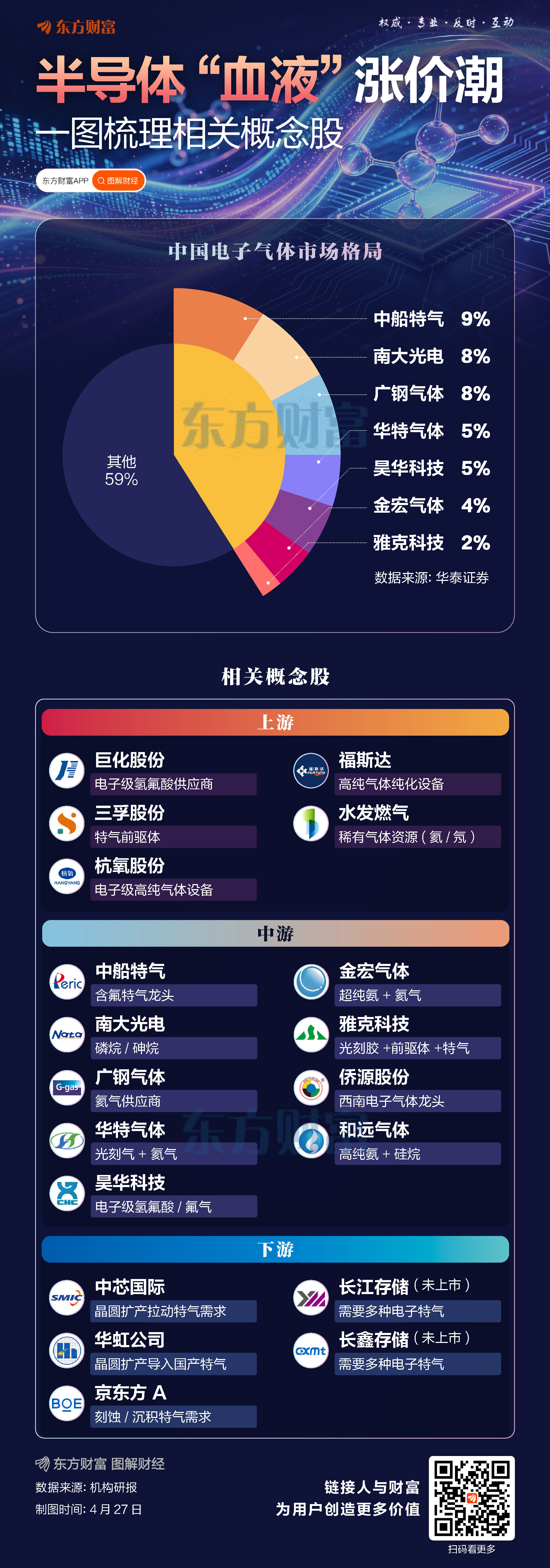 华泰证券研报显示,国内电子气体市场格局方面,中船特气、南大光电、广钢气体、华特气体、昊华科技、金宏气体、雅克科技等7家厂商合计市占率为41%,国产化率有望进一步提升。