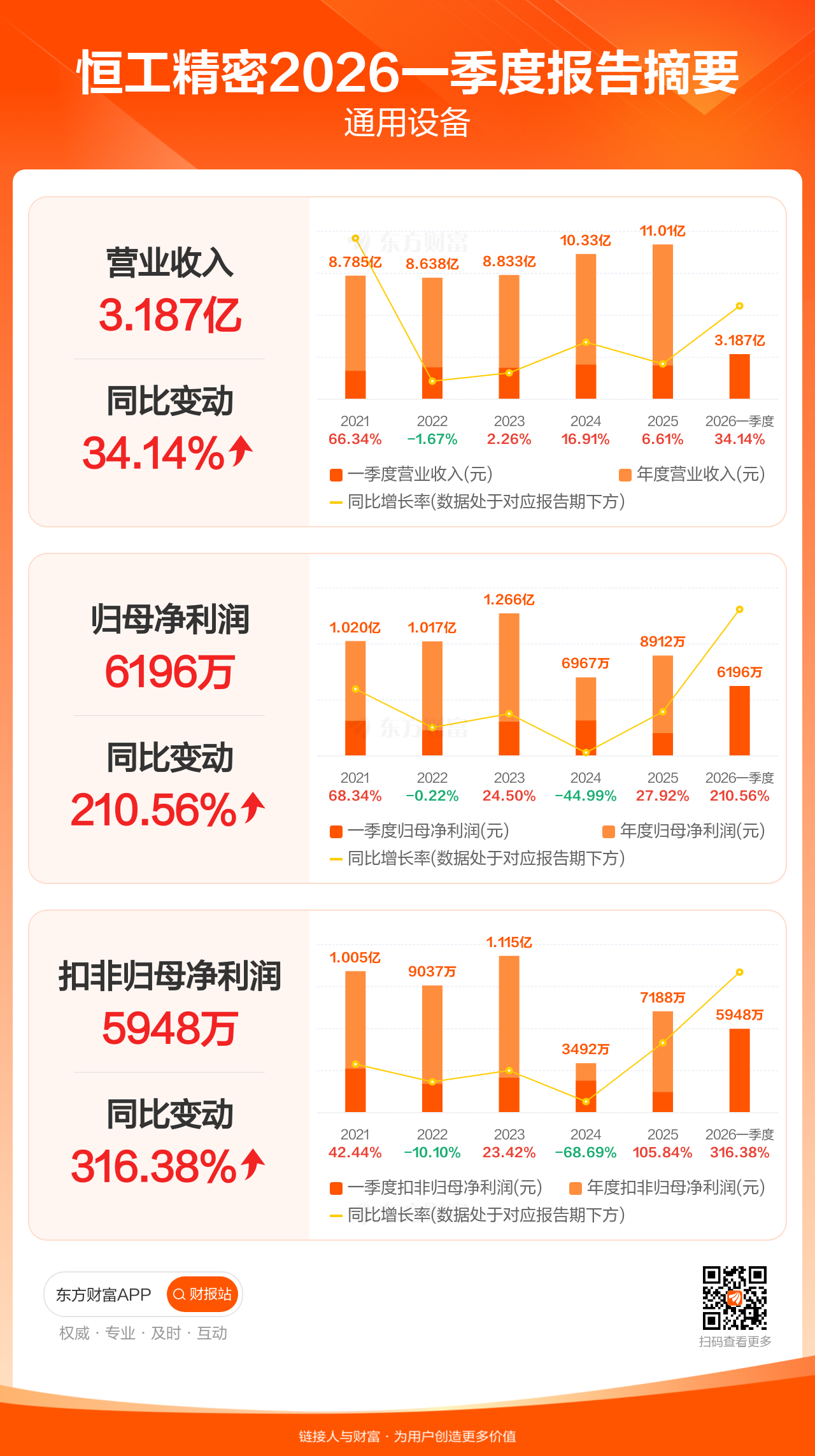 恒工精密4月28日发布2026年一季报显示,公司一季度实现营业收入3.19亿元,同比增长34.14%;归母净利润6195.84万元,同比增长210.56%;扣非归母净利润5947.71万元,同比增长316.38%。