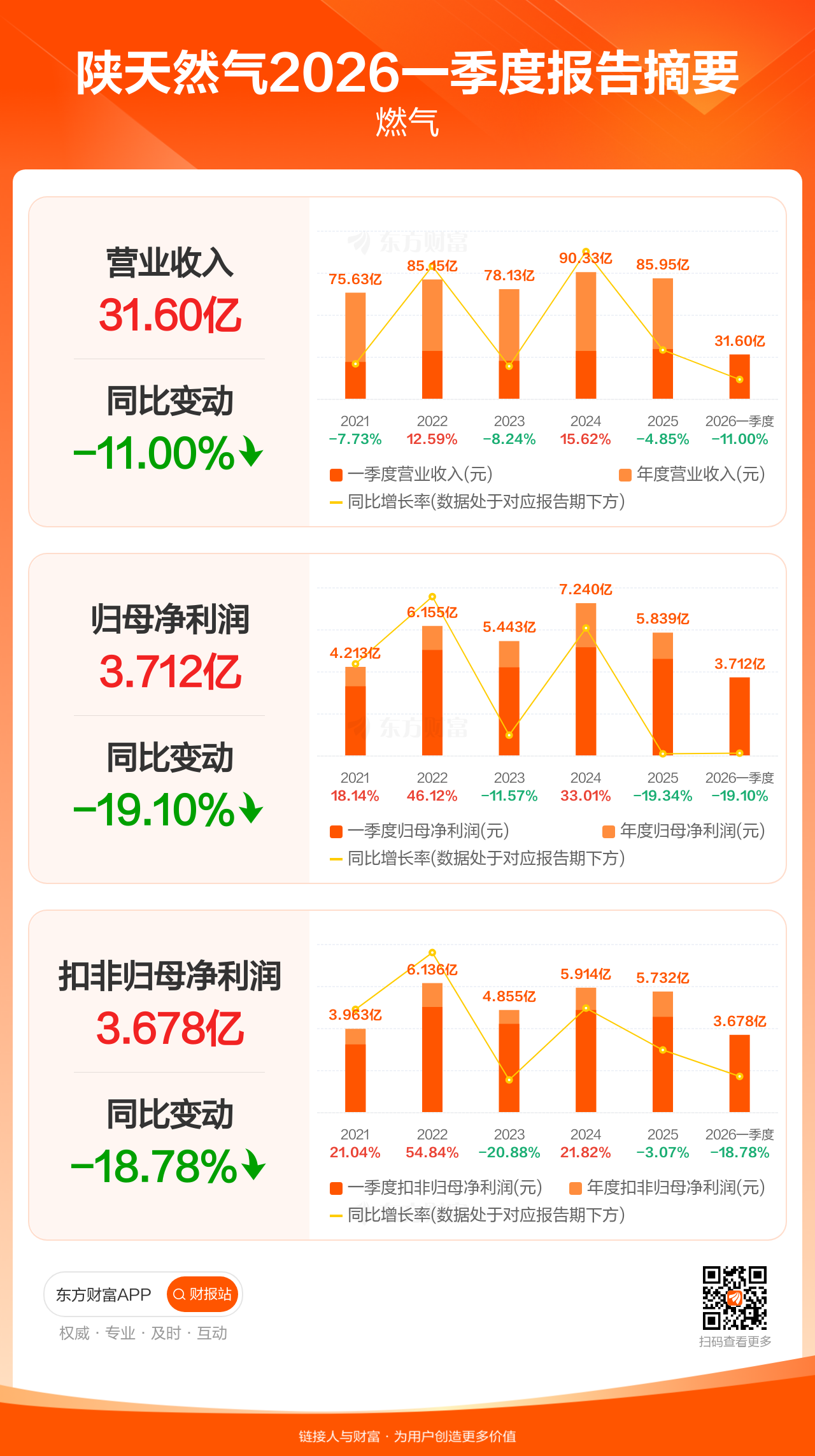 陕天然气4月28日发布2026年一季报显示,公司一季度实现营业收入31.60亿元,同比下滑11.00%;归母净利润3.71亿元,同比下滑19.10%;扣非归母净利润3.68亿元,同比下滑18.78%。