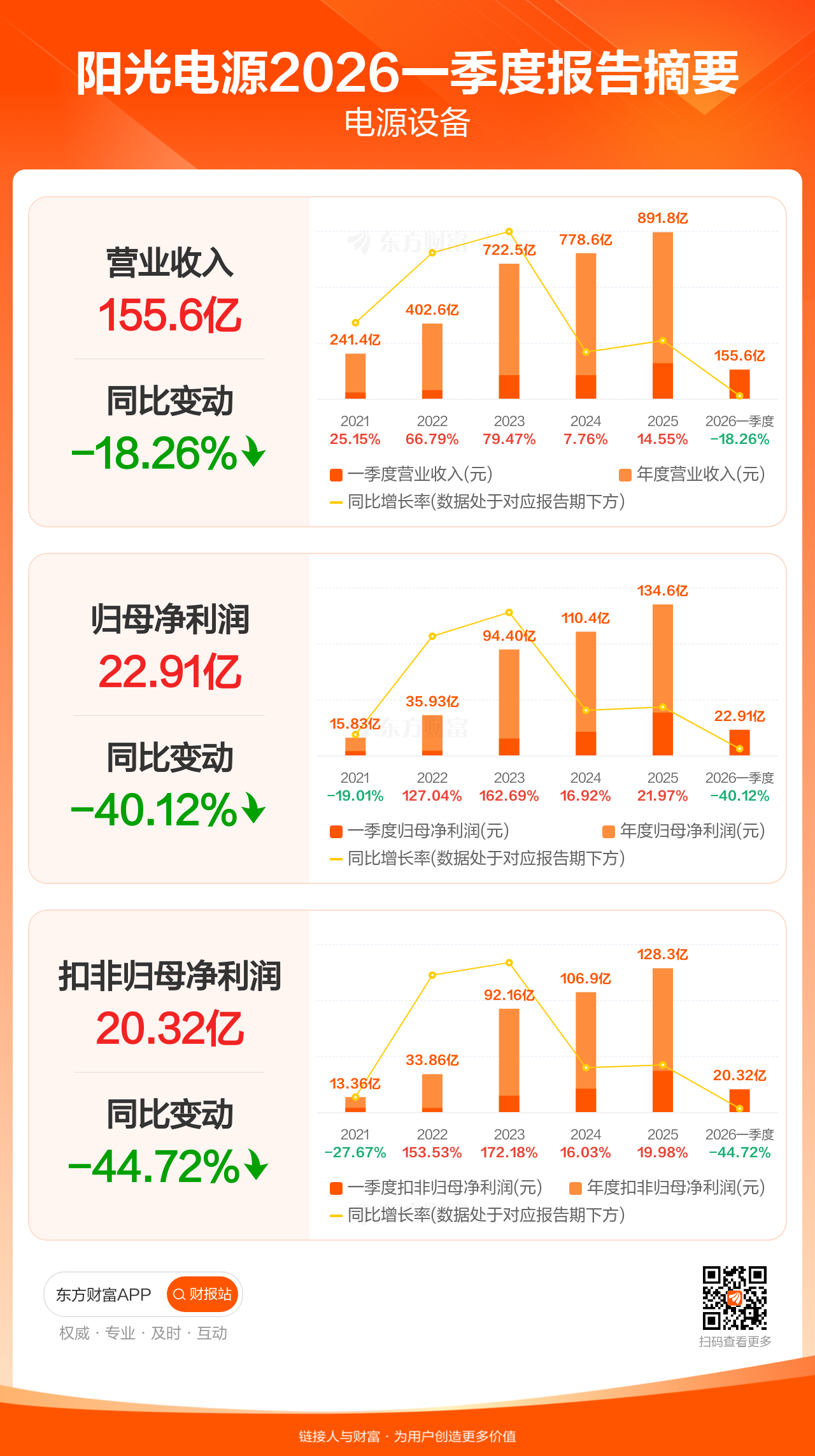 阳光电源4月28日发布2026年一季报显示,公司一季度实现营业收入155.61亿元,同比下滑18.26%;归母净利润22.91亿元,同比下滑40.12%;扣非归母净利润20.32亿元,同比下滑44.72%。