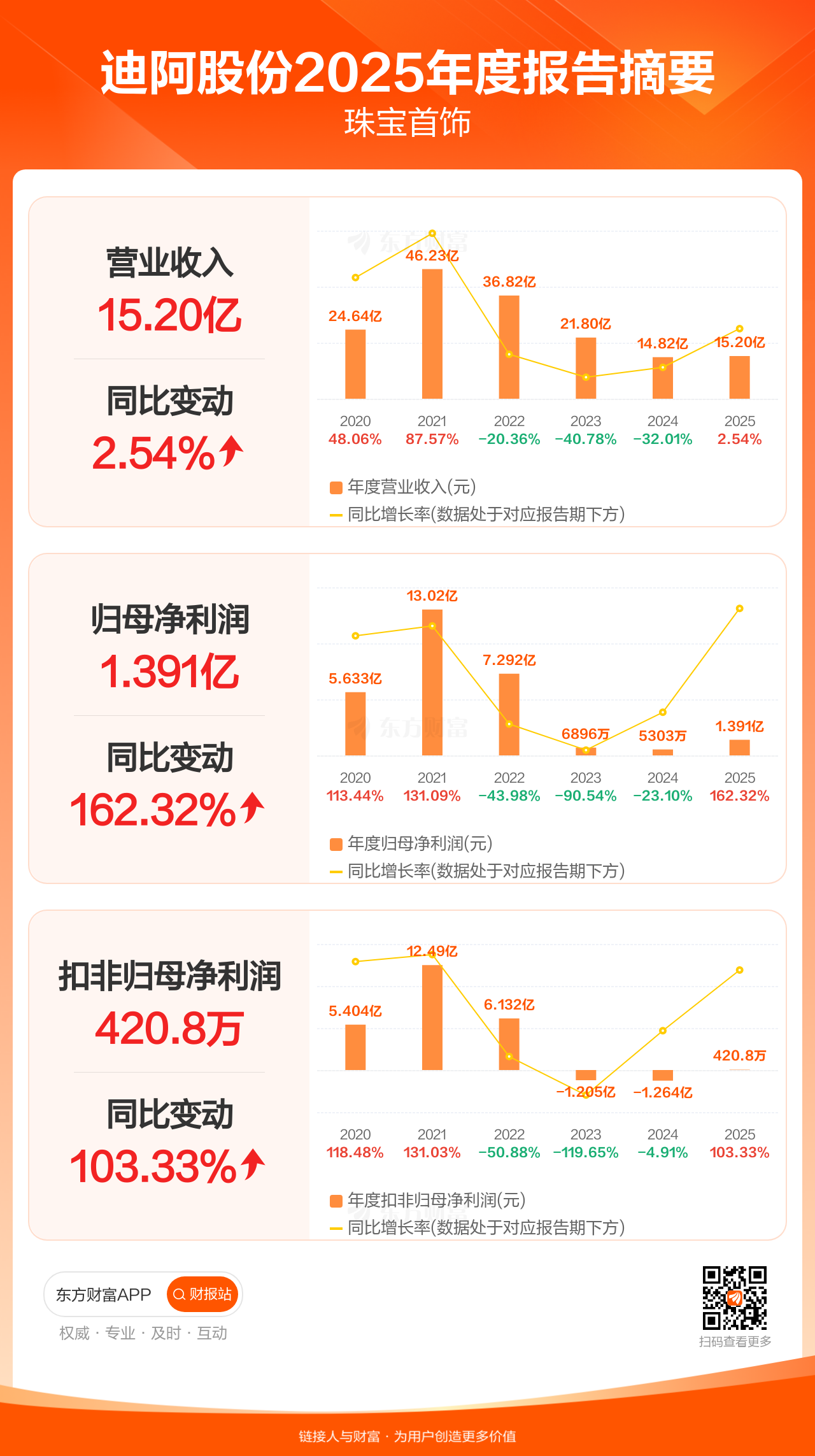 迪阿股份4月28日发布2025年年报显示,公司全年实现营业收入15.20亿元,同比增长2.54%;归母净利润1.39亿元,同比增长162.32%;扣非归母净利润420.81万元,同比增长103.33%。