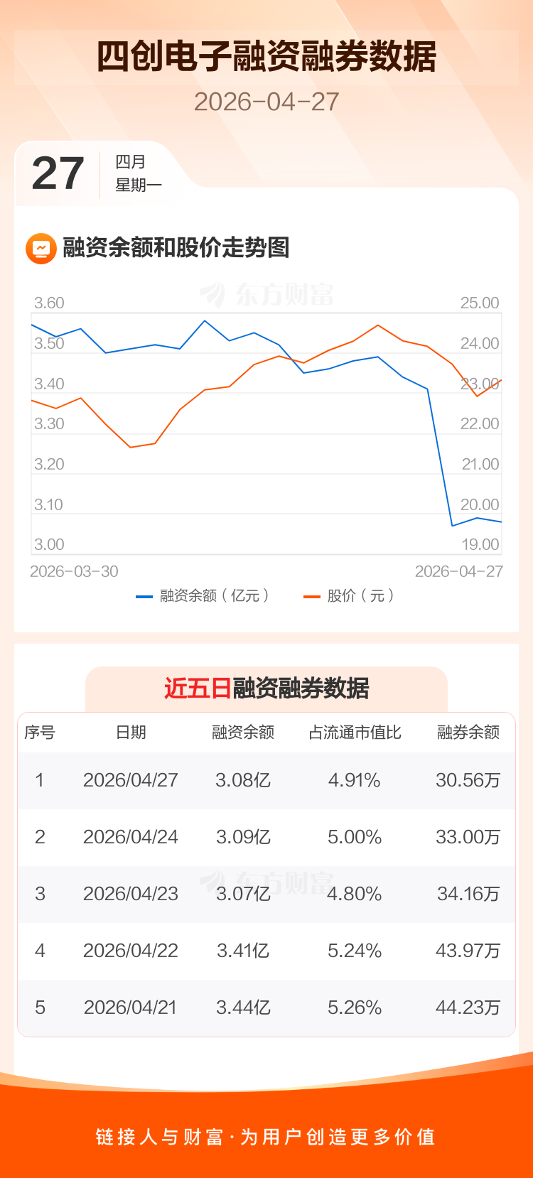交易所最新数据显示,四创电子于2026年4月27日获融资买入809.85万元,融资偿还829.55万元,当日融资净偿还19.7万元。目前,该股融资余额3.08亿,占流通市值比例为4.91%。