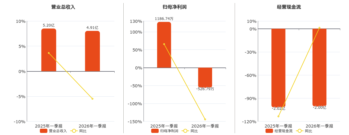 公司营业总收入为4.91亿元,在已披露的同业公司中排名第26,较去年同报告期营业总收入减少2855.86万元,同比较去年同期下降5.49%。归母净利润为-526.79万元,在已披露的同业公司中排名第39,较去年同报告期归母净利润减少1713.54万元,同比较去年同期下降144.39%。经营活动现金净流入为-2.00亿元,在已披露的同业公司中排名第38,较去年同报告期经营活动现金净流入增加248.24万元。