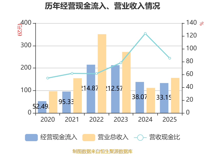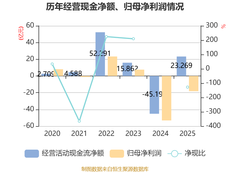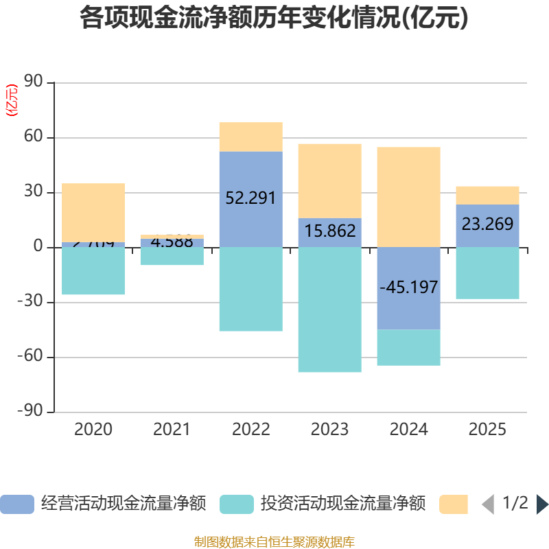 截至2025年,公司经营活动现金流净额为23.27亿元,同比增加68.47亿元;筹资活动现金流净额9.86亿元,同比减少44.76亿元;投资活动现金流净额-28.42亿元,上年同期为-19.6亿元。