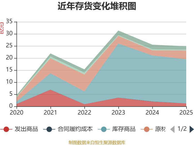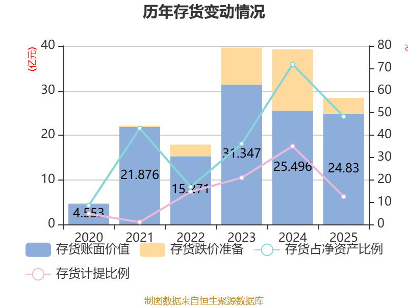 从存货变动来看,截至2025年末,公司存货账面价值为24.83亿元,占净资产的48.32%,较上年末减少6655.7万元。其中,存货跌价准备为3.54亿元,计提比例为12.47%。