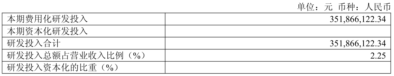 2025年全年,公司研发投入金额为3.52亿元,同比下降49.29%;研发投入占营业收入比例为2.25%,相比上年同期下降3.97个百分点。