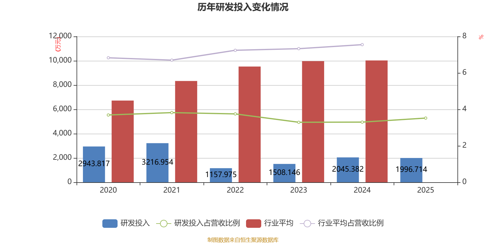 2025年全年,公司研发投入金额为1996.71万元,同比下降2.38%;研发投入占营业收入比例为3.52%,相比上年同期上升0.22个百分点。此外,公司全年研发投入资本化率为0%。