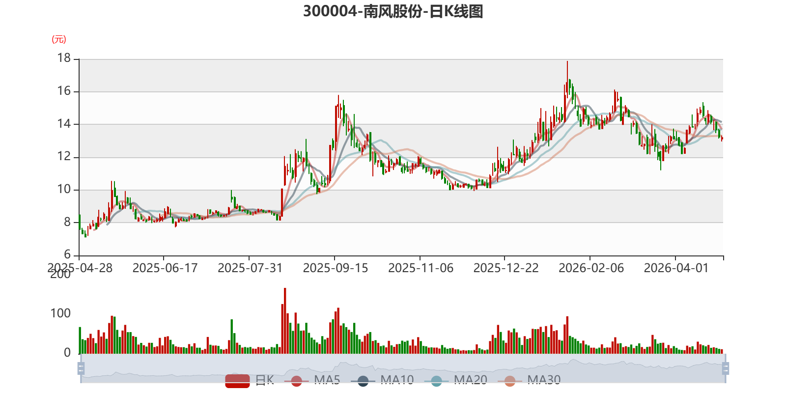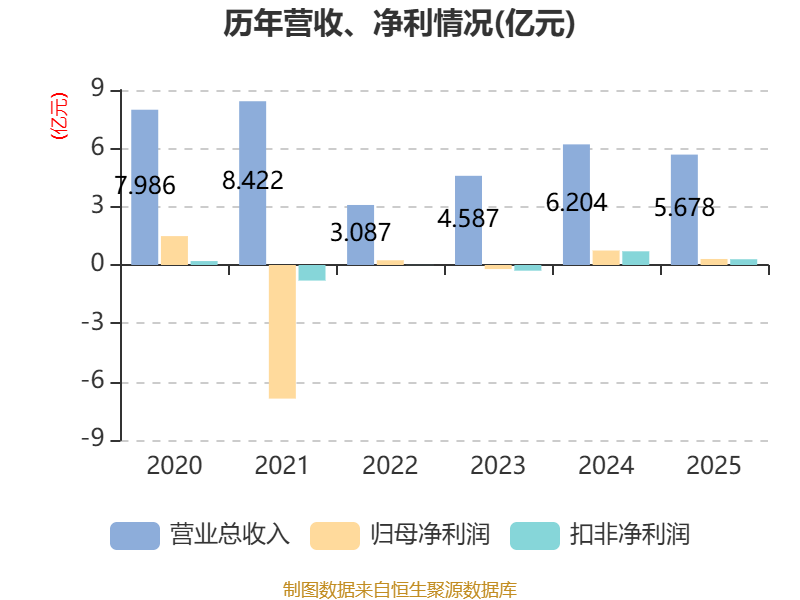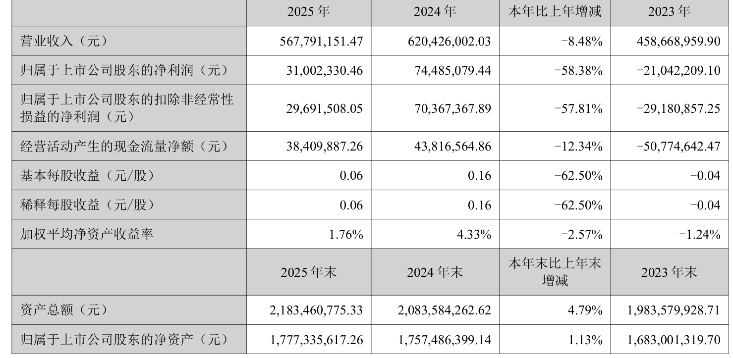 中证智能财讯南风股份(300004)4月28日披露2025年年度报告。2025年,公司实现营业总收入5.68亿元,同比下降8.48%;归母净利润3100.23万元,同比下降58.38%;扣非净利润2969.15万元,同比下降57.81%;经营活动产生的现金流量净额为3840.99万元,同比下降12.34%;报告期内,南风股份基本每股收益为0.06元,加权平均净资产收益率为1.76%。