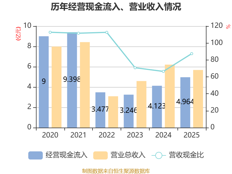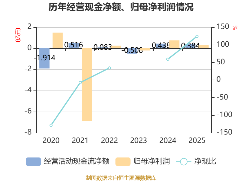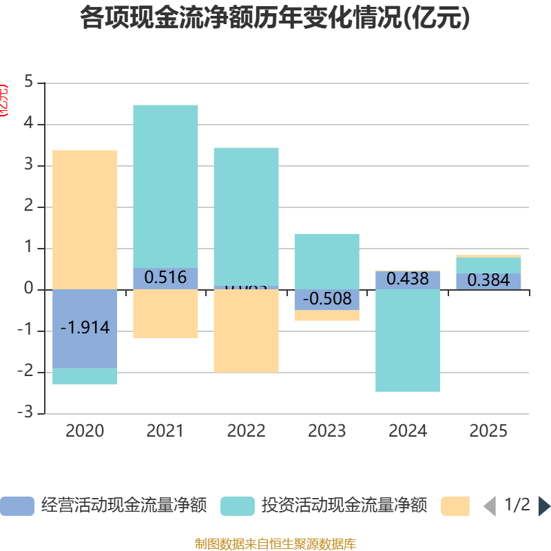 截至2025年,公司经营活动现金流净额为3840.99万元,同比下降12.34%;筹资活动现金流净额606.6万元,同比增加416.2万元;投资活动现金流净额3868.59万元,上年同期为-2.48亿元。