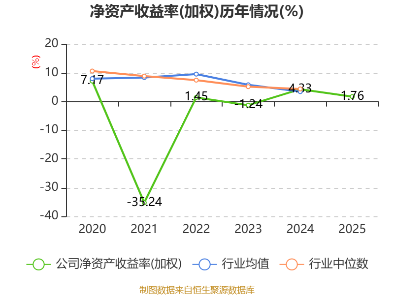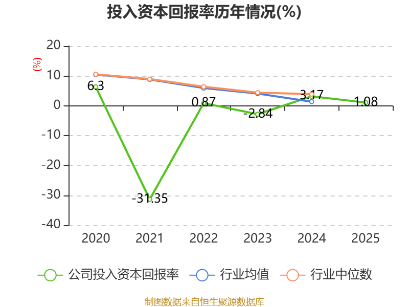 数据显示,2025年公司加权平均净资产收益率为1.76%,较上年同期下降2.57个百分点。公司2025年投入资本回报率为1.08%,较上年同期下降2.09个百分点。