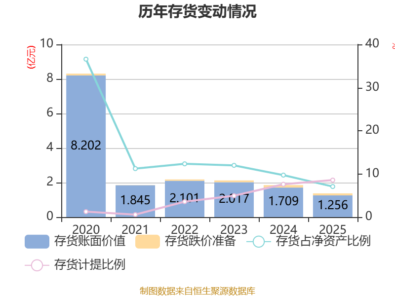 从存货变动来看,截至2025年末,公司存货账面价值为1.26亿元,占净资产的7.07%,较上年末减少4532.34万元。其中,存货跌价准备为1174.88万元,计提比例为8.56%。