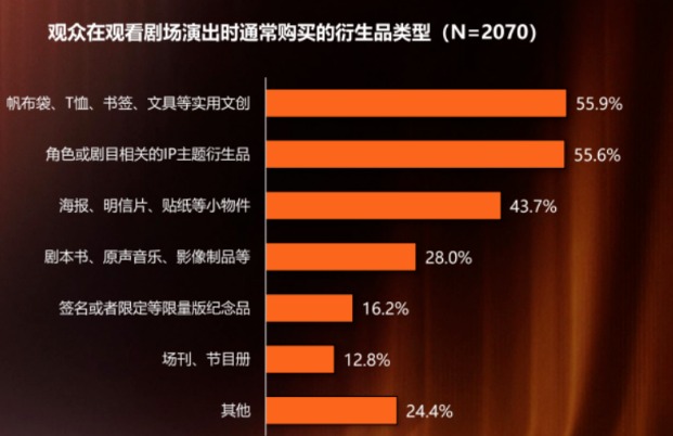 调研显示,20.4%的观众在观演前后会选择现场购买剧场或剧目相关的衍生品。最受观众欢迎的衍生品类型是帆布袋、T恤、书签、文具等实用文创类衍生品和角色或剧目相关的形象周边、玩偶、模型、摆件等IP主题衍生品。