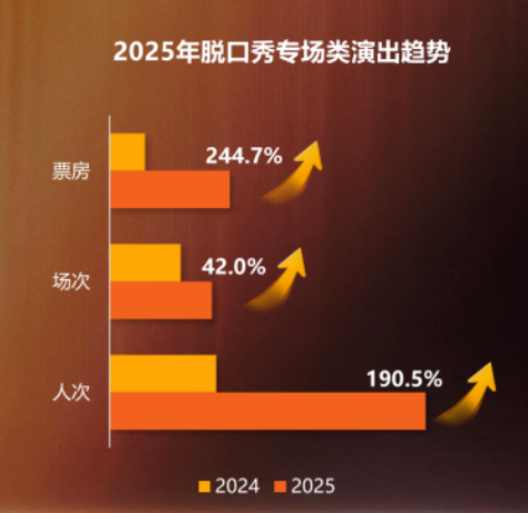 2025年,脱口秀演出精品化与大众普及化双线并行。小剧场及新空间脱口秀凭借75.7%的场次供给与55.1%的人次占比,成为脱口秀市场的供给主体与大众消费基础;同时,头部脱口秀项目进驻专业剧场,专业剧场脱口秀人次占比达44.9%。