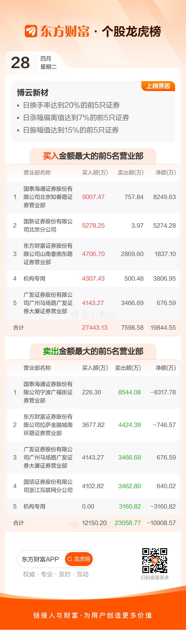 交易所2026年4月28日公布的交易公开信息显示,博云新材因成为日换手率达到20%的前5只证券、日振幅值达到15%的前5只证券、日涨幅偏离值达到7%的前5只证券上榜。博云新材当日收报22.58元,涨跌幅9.99%,偏离值35.26%,换手率35.26%,成交额43.41亿。