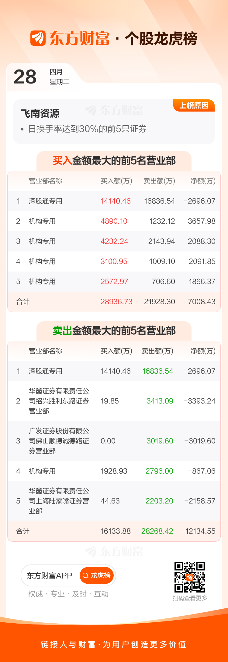 交易所2026年4月28日公布的交易公开信息显示,飞南资源因成为日换手率达到30%的前5只证券上榜。飞南资源当日收报29.94元,涨跌幅-1.25%,偏离值44.72%,换手率44.72%,成交额20.14亿。