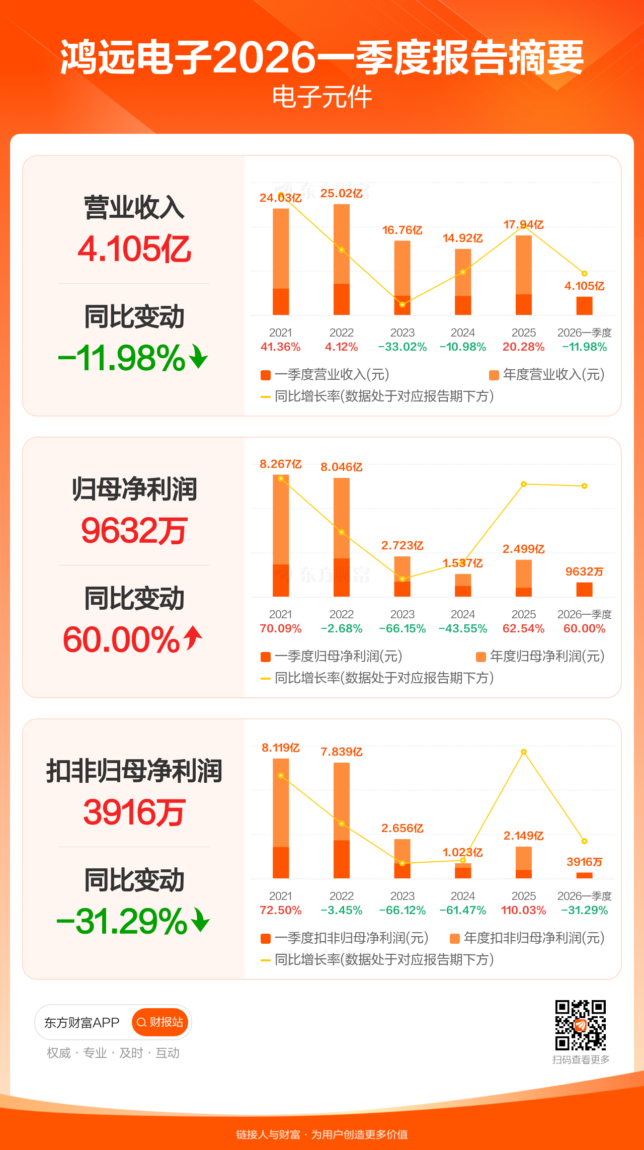 鸿远电子4月29日发布2026年一季报显示,公司一季度实现营业收入4.11亿元,同比下滑11.98%;归母净利润9632.09万元,同比增长60.00%;扣非归母净利润3916.38万元,同比下滑31.29%。