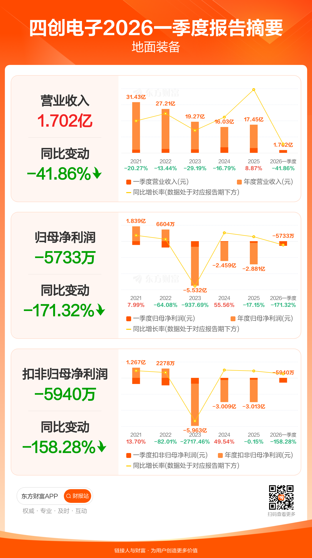 四创电子4月29日发布2026年一季报显示,公司一季度实现营业收入1.70亿元,同比下滑41.86%;归母净利润-5732.90万元;扣非归母净利润-5940.44万元。