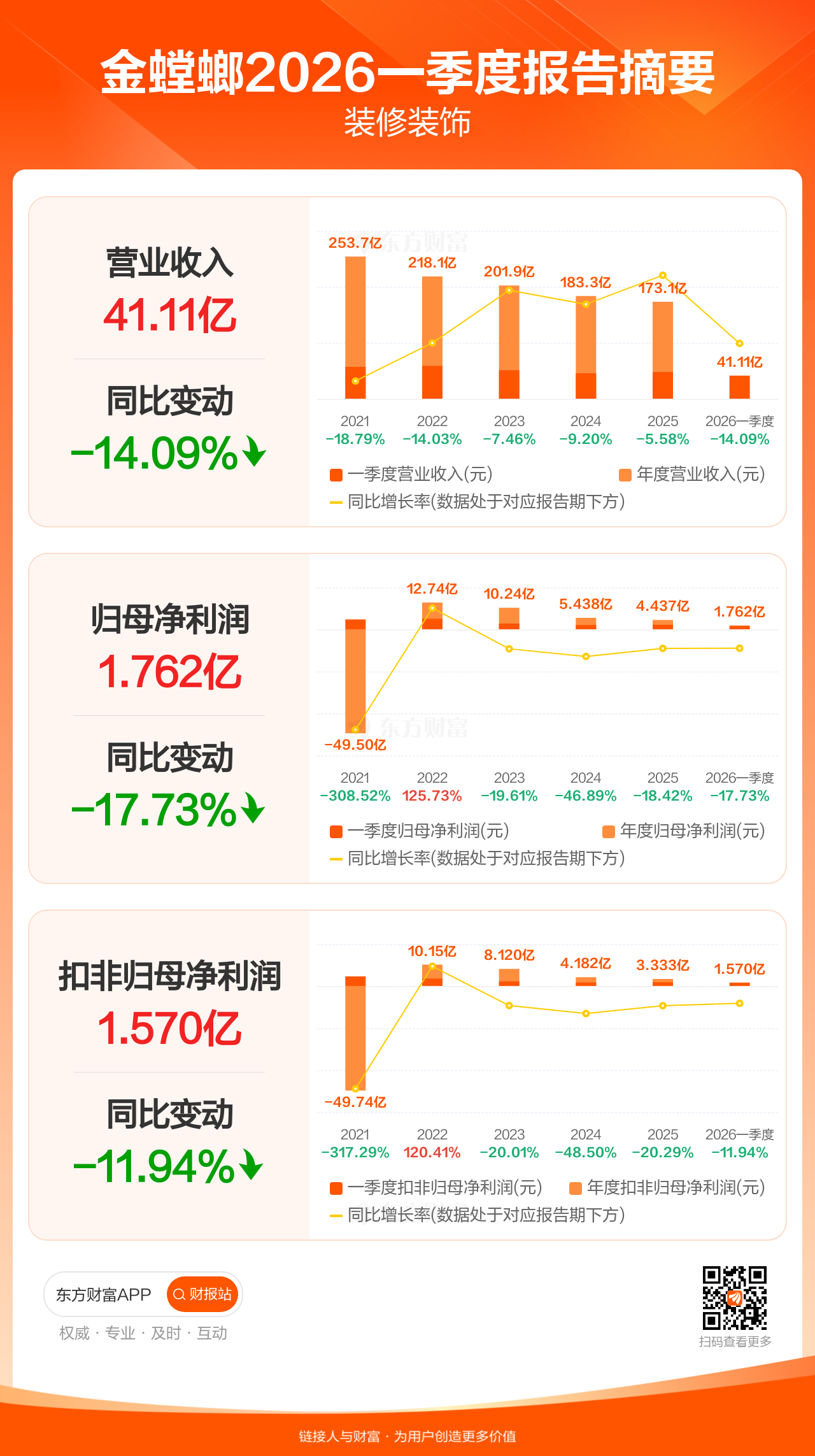 金螳螂4月29日发布2026年一季报显示,公司一季度实现营业收入41.11亿元,同比下滑14.09%;归母净利润1.76亿元,同比下滑17.73%;扣非归母净利润1.57亿元,同比下滑11.94%。