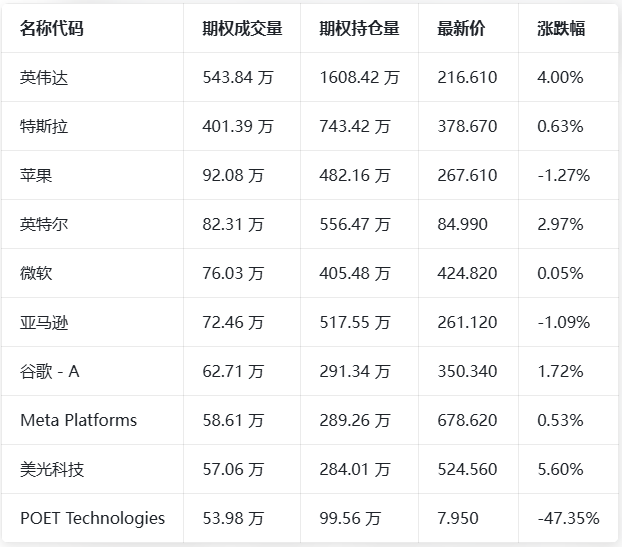 半导体板块整体分化,费城半导体指数结束18连涨行情并进入回调,但英伟达、谷歌-C 逆势走强并刷新股价新高。其中英伟达盘前下跌3.06%,期权数据情绪偏多,其看跌/看涨成交比0.38,隐含波动率49.52%,维持历史偏高区间,体现市场仍以看涨期权布局为主,持续押注其后续上行行情。