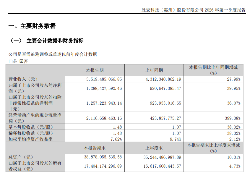 4月28日,胜宏科技(300476.SZ)公告称,2026年第一季度实现营业收入55.19亿元,同比增长27.99%;归属于上市公司股东的净利润为12.88亿元,同比增长39.95%。业绩变动主要系销售额增加所致。