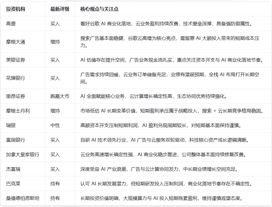 当前机构对谷歌评级整体呈现高度乐观态势,66位覆盖分析师中,59位给予“买入”或“强烈买入”评级,仅7位给予“持有”评级,暂无“卖出”评级。目标价方面,整体呈上行趋势,平均目标价区间均值为378.5美元,最高目标价达443美元,反映出机构对公司长期价值的分歧较小、信心较强。 近三个月以来,多家机构密集上调目标价,核心驱动因素集中在Gemini AI商业化进展超预期、云业务盈利能力持续改善两大方面。