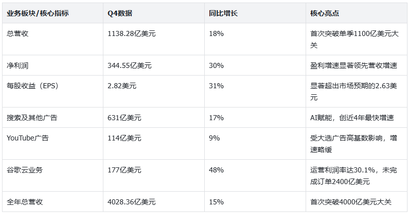 谷歌2025财年第四季度业绩表现亮眼,显著超出市场预期。各核心财务指标及业务板块具体表现如下表所示,整体呈现营收、利润双位数高增长态势,广告业务稳健发力,云业务实现爆发式增长,充裕的现金流为公司长期AI布局与技术研发提供了坚实支撑。