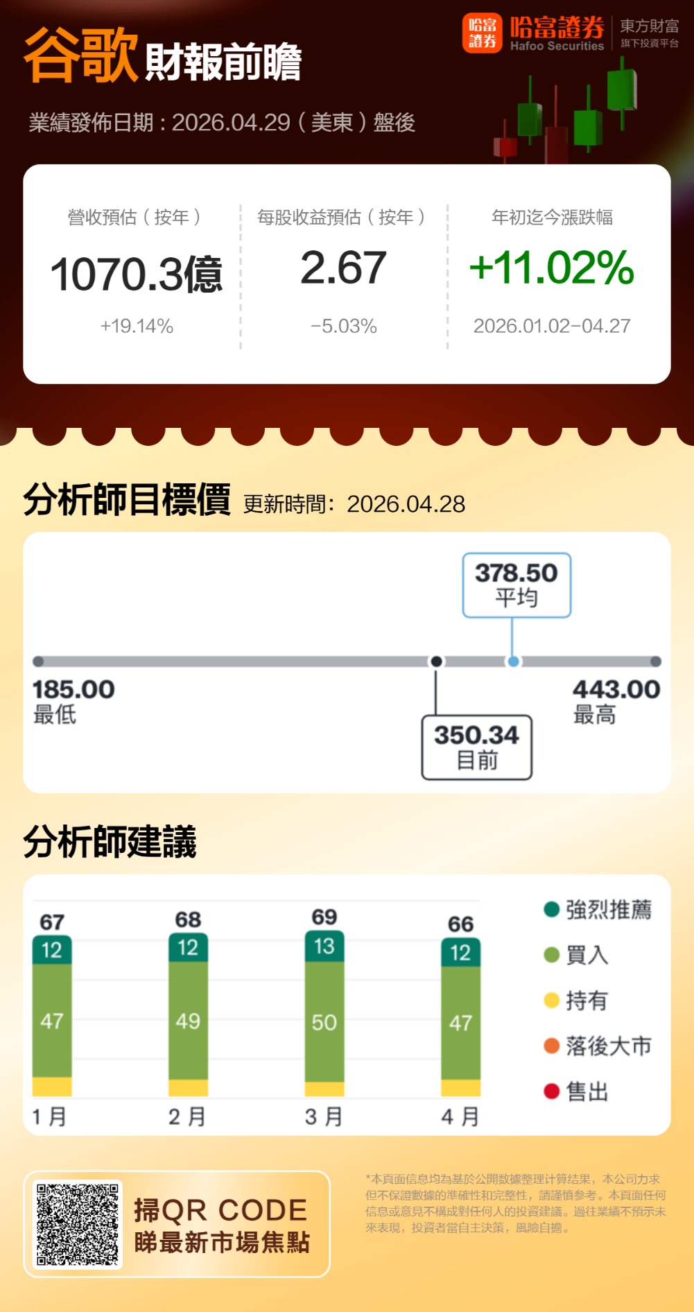 谷歌将于美东时间4月29日(周三)盘后发布2026年第一季度财报。分析师预测谷歌Q1营收1070.3亿美元,同比增长19.14%;每股收益2.67美元,同比下降5.03%。