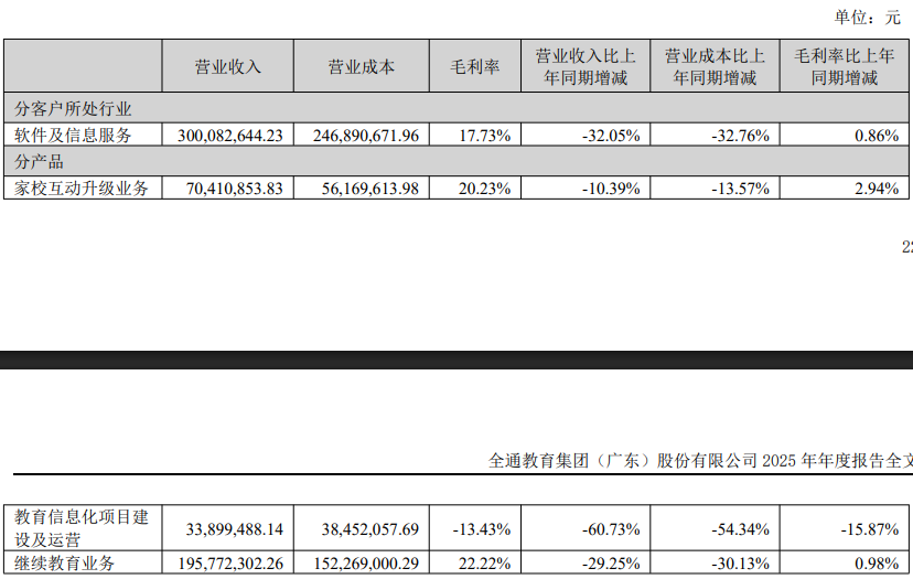 2025年,受行业政策、市场竞争加剧、客户预算紧张和需求下降的影响,以及部分项目潜在应收账款风险较高,为保障公司安全的现金流,维护公司稳健运营,公司主动提高部分业务的甄选标准,从而放弃部分业务机会等综合因素导致公司继续教育业务、家校互动升级业务、教育信息化业务收入同比有所减少,但维持项目开展的固定成本未能以同等金额减少,导致公司毛利下降。