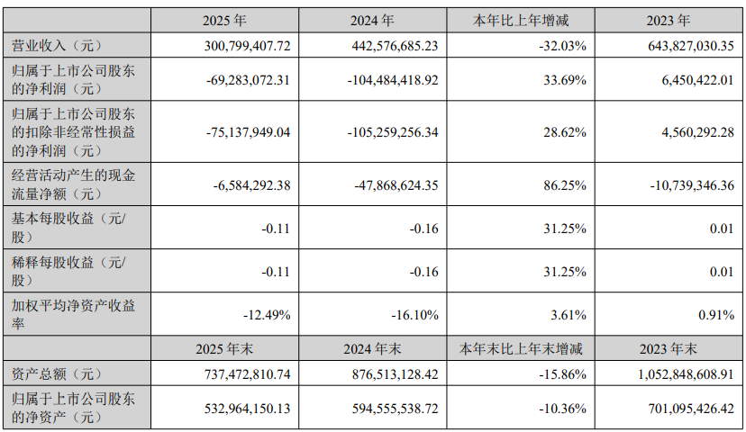 这是公司连续第二年规模收缩。2024年,公司营收同比降31.26%至4.43亿元。2025年营收3.01亿元,较2023年6.44亿元营收规模降53.26%。