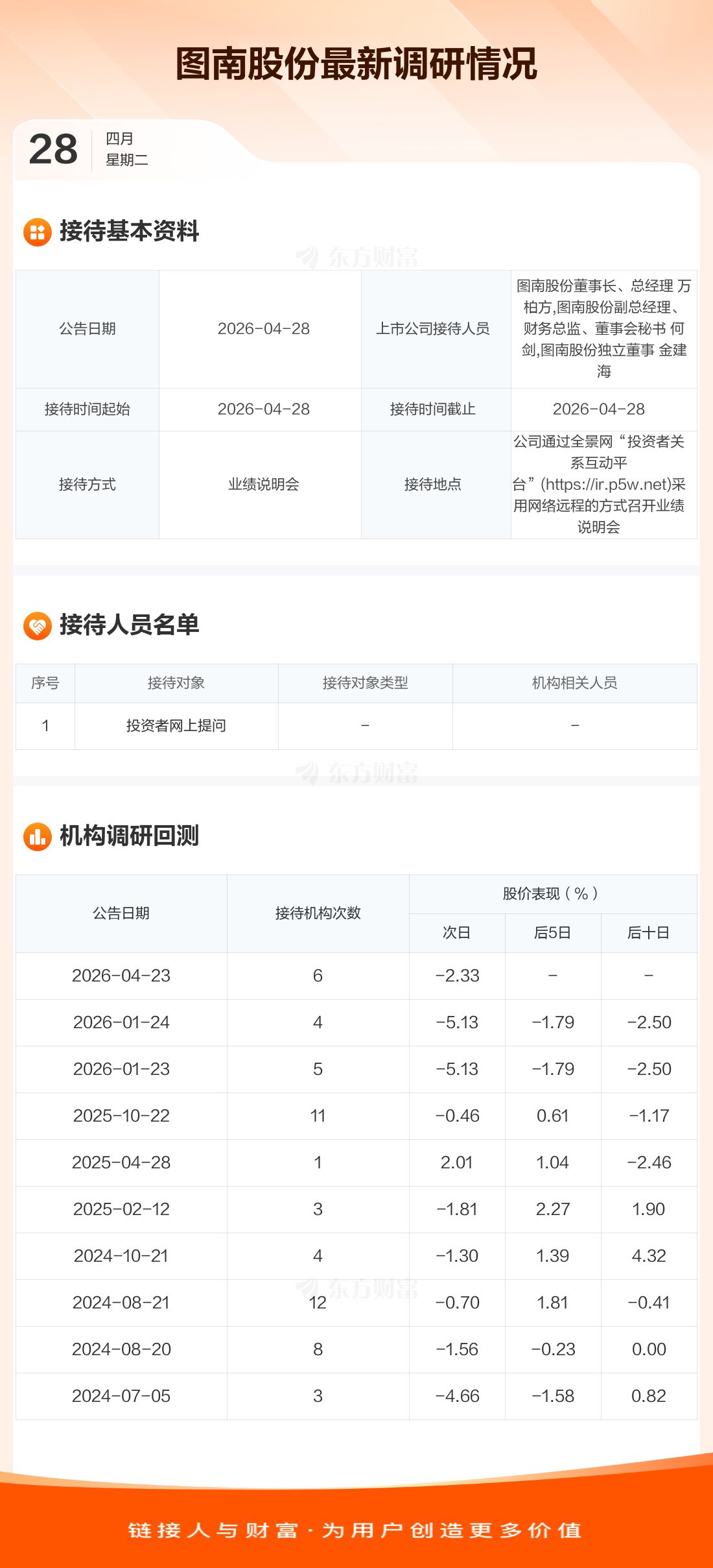 图南股份4月28日公告称,4月28日接待投资者网上提问调研。接待人员包括图南股份董事长、总经理 万柏方,图南股份副总经理、财务总监、董事会秘书 何剑,图南股份独立董事 金建海。