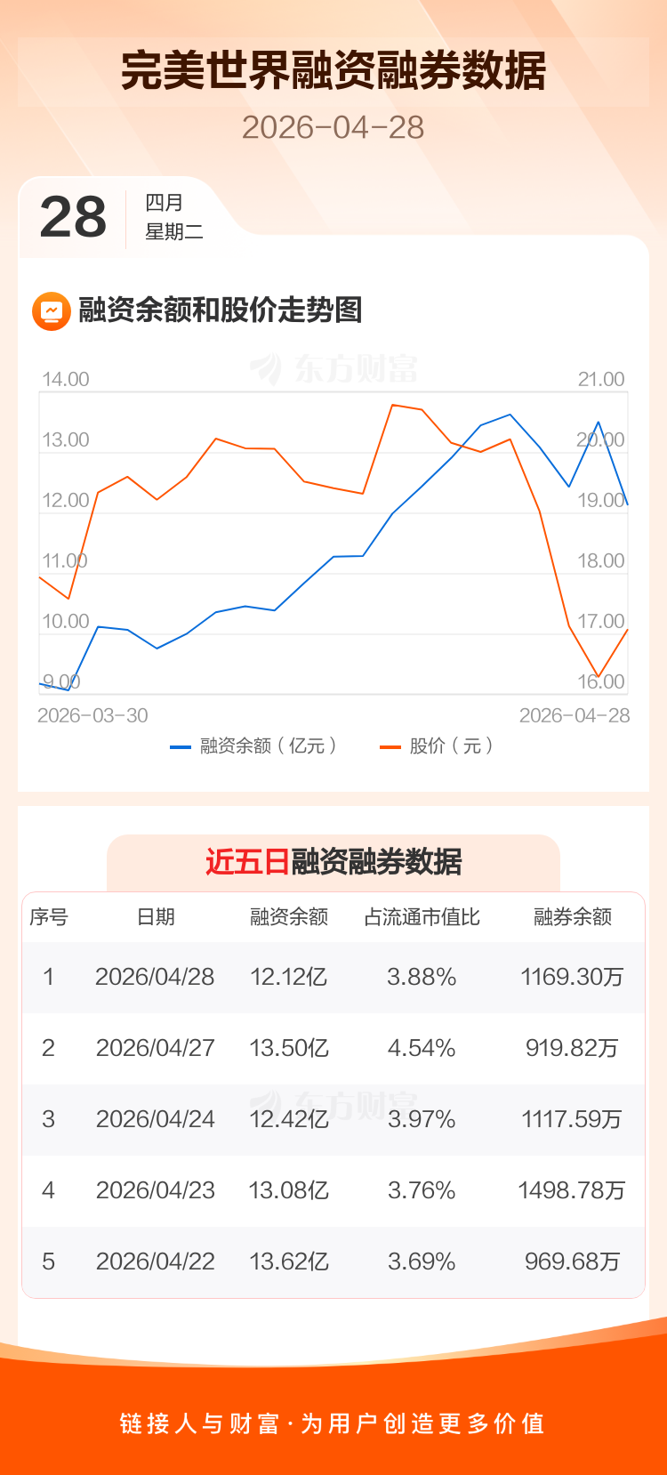 交易所最新数据显示,完美世界于2026年4月28日获融资买入8118.99万元,融资偿还2.19亿元,当日融资净偿还1.38亿元。目前,该股融资余额12.12亿,占流通市值比例为3.88%。