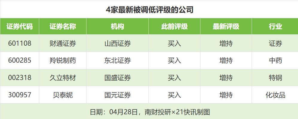 评级调低方面,4月28日,券商调低上市公司评级达到4家次,最新数据包括了山西证券对财通证券的评级从“买入”调低至“增持”,东北证券对羚锐制药的评级从“买入”调低至“增持”,国盛证券对久立特材的评级从“买入”调低至“增持”。
