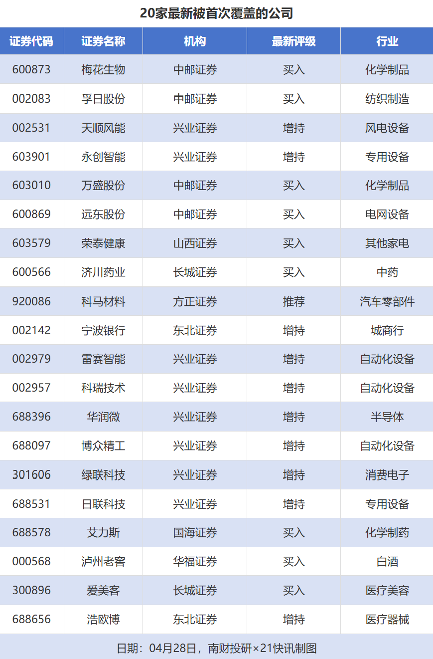 首次覆盖方面,4月28日券商共给出了22次首次覆盖,其中梅花生物、孚日股份、万盛股份获得中邮证券分别给予“买入”评级,天顺风能、永创智能获得兴业证券分别给予“增持”评级。