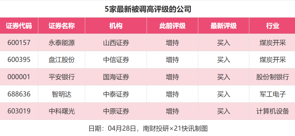 评级调高方面,4月28日,券商调高上市公司评级达到5家次,最新数据包括了山西证券对永泰能源的评级从“增持”调高至“买入”,中信证券对盘江股份的评级从“增持”调高至“买入”,国海证券对平安银行的评级从“增持”调高至“买入”。