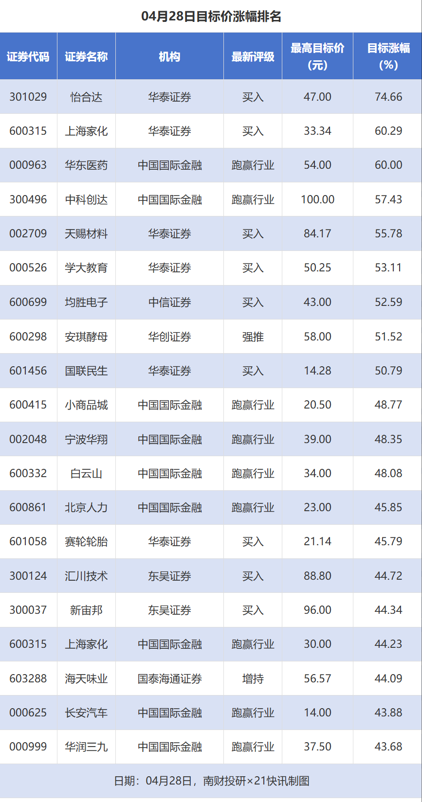 南财投研数据显示,4月28日,券商给予上市公司目标价共191次,按最新收盘价计算,目标价涨幅排名居前的公司有怡合达、上海家化、华东医药,目标价涨幅分别为74.66%、60.29%、60.00%,分别属于自动化设备、化妆品、化学制药行业。