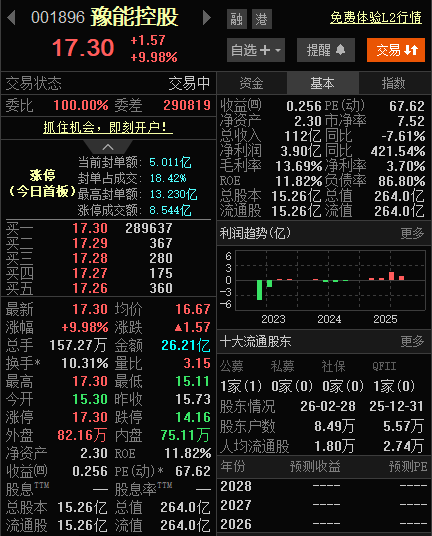 【大河财立方消息】4月29日,A股绿电概念延续强势,豫能控股涨停,封单超13亿元,华电能源涨超8%,金开新能、华电辽能、明星电力、西昌电力跟涨。