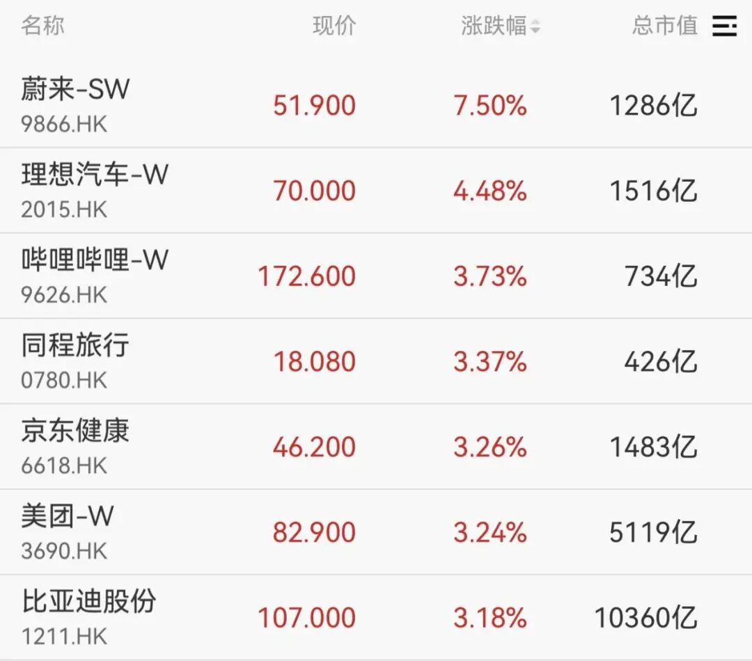 港股新能源汽车板块走高,蔚来涨超7%,理想汽车、比亚迪股份、广汽集团等跟涨。