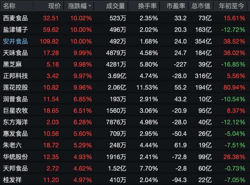 食品股盘初走强,西麦食品、盐津铺子、安井食品、天味食品、黑芝麻等多股涨停。