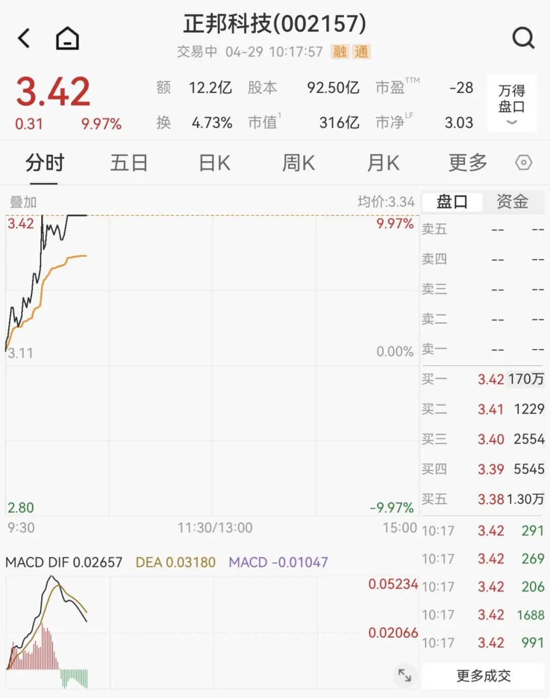 猪肉股震荡拉升,正邦科技170万手封涨停,股价报3.42元/股,总市值为316亿元。