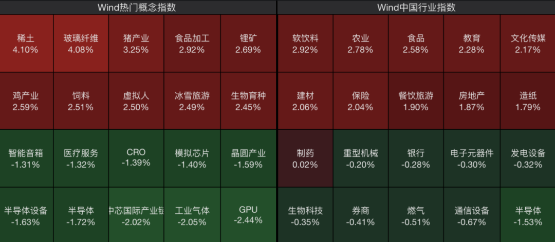 从板块来看,食品板块涨幅居前,农业、房地产、文化传媒等板块表现活跃;而半导体、算力硬件、燃气等板块跌幅居前。