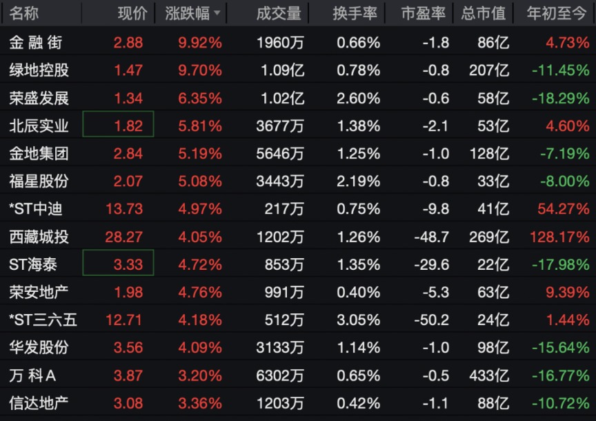 房地产板块快速拉升,金融街、绿地控股、荣盛发展等均涨超5%。