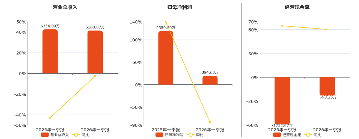 公司营业总收入为6168.87万元,在已披露的同业公司中排名第86,较去年同报告期营业总收入减少165.13万元,同比较去年同期下降2.61%。归母净利润为384.63万元,在已披露的同业公司中排名第37,较去年同报告期归母净利润减少1974.96万元,同比较去年同期下降83.70%。经营活动现金净流入为-698.23万元,在已披露的同业公司中排名第20,较去年同报告期经营活动现金净流入增加1054.44万元,实现2年连续上涨。