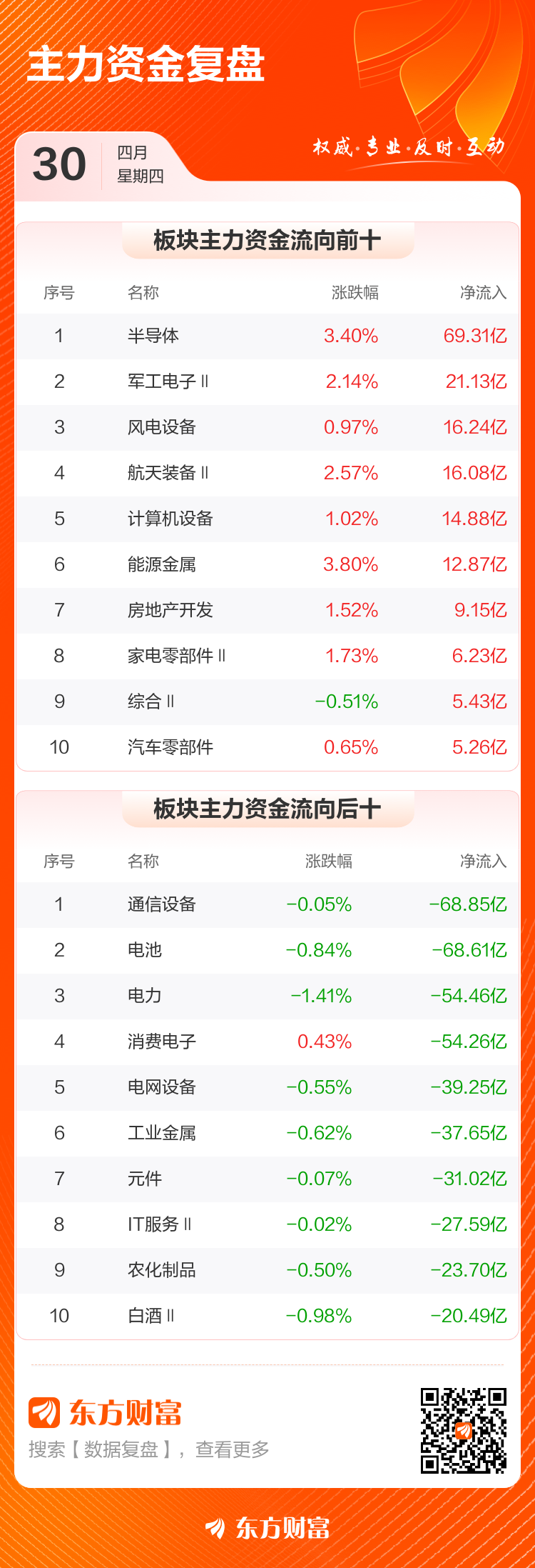 4月30日,沪指涨0.11%,深成指跌0.09%,创业板指跌0.27%。两市成交额2.74万亿,较上个交易日放量1508亿。数据显示,今日大盘主力资金净流出520.29亿。半导体、军工电子Ⅱ、风电设备等板块主力资金流入排名居前,其中半导体净流入69.31亿元。