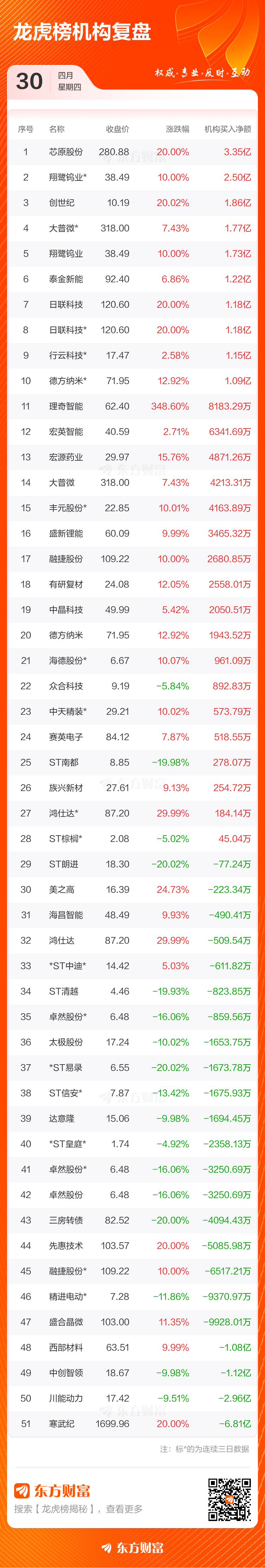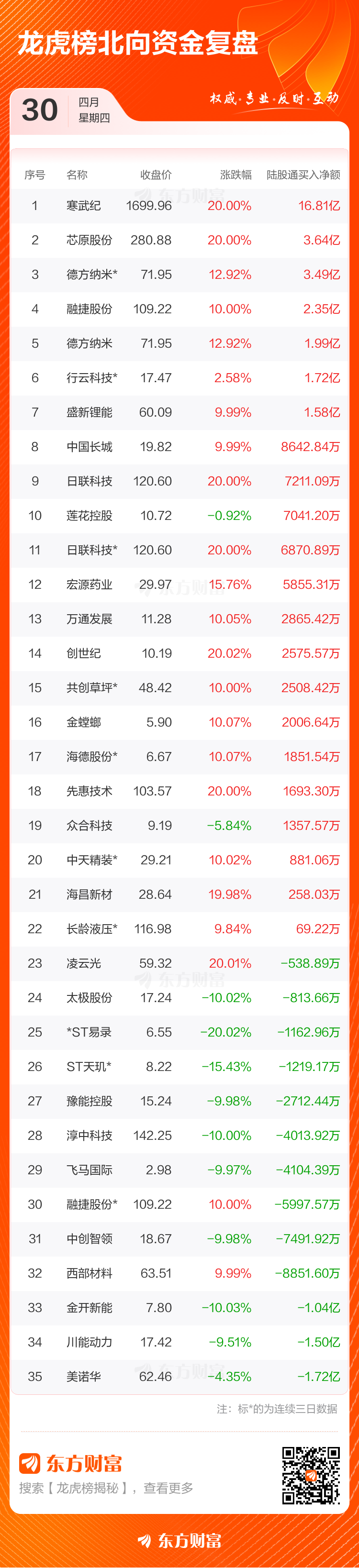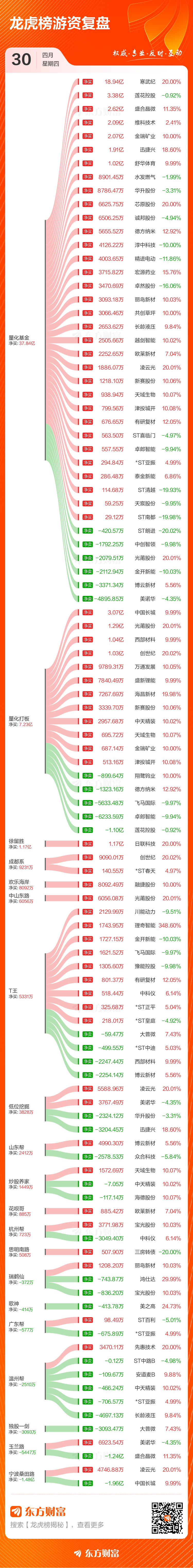 4月30日共有86只个股(含1只可转债)上榜龙虎榜,总上榜成交额415.57亿元。上榜个股中净买入额最高的是寒武纪,金额为20.42亿元。