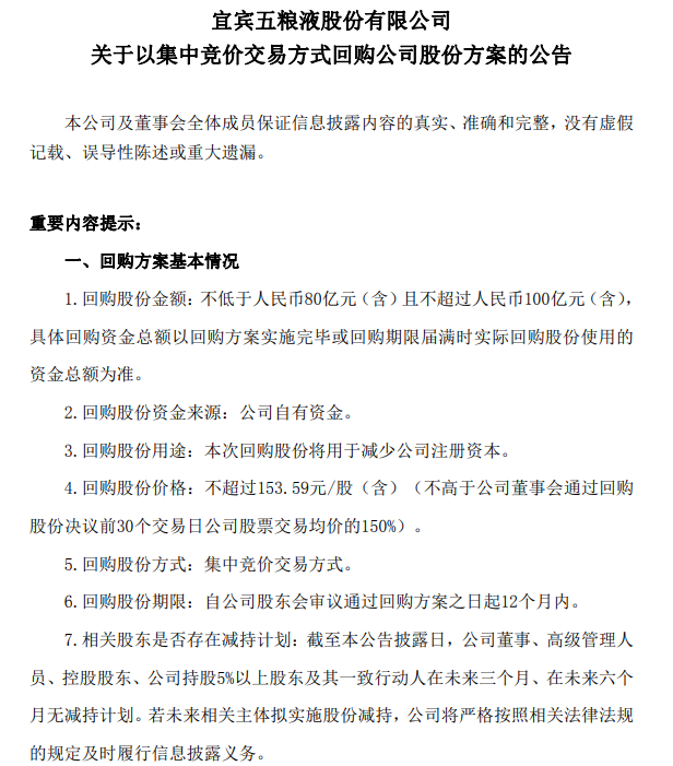 五粮液4月30日公告,拟以集中竞价交易方式回购公司股份,回购总金额不低于80亿元且不超过100亿元。回购价格不超过153.59元/股。回购股份将用于减少公司注册资本。回购期限为自公司股东会审议通过回购方案之日起12个月内。